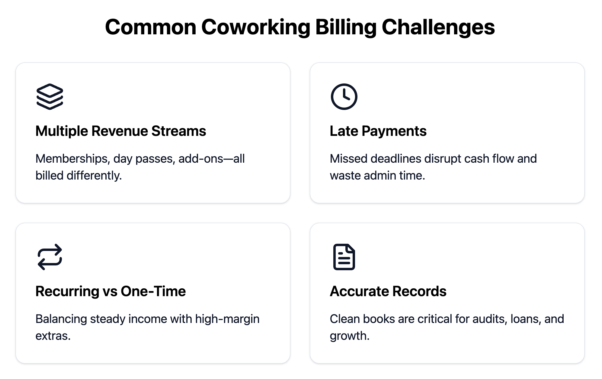 The most common billing and payment challenges in a coworking space include tracking multiple revenue streams, handling late payments, balancing recurring and one-time charges, and keeping financial records audit-ready. Missed or duplicated charges reduce cash flow and damage trust, while manual reconciliation across spreadsheets and payment processors becomes unsustainable as a space grows.