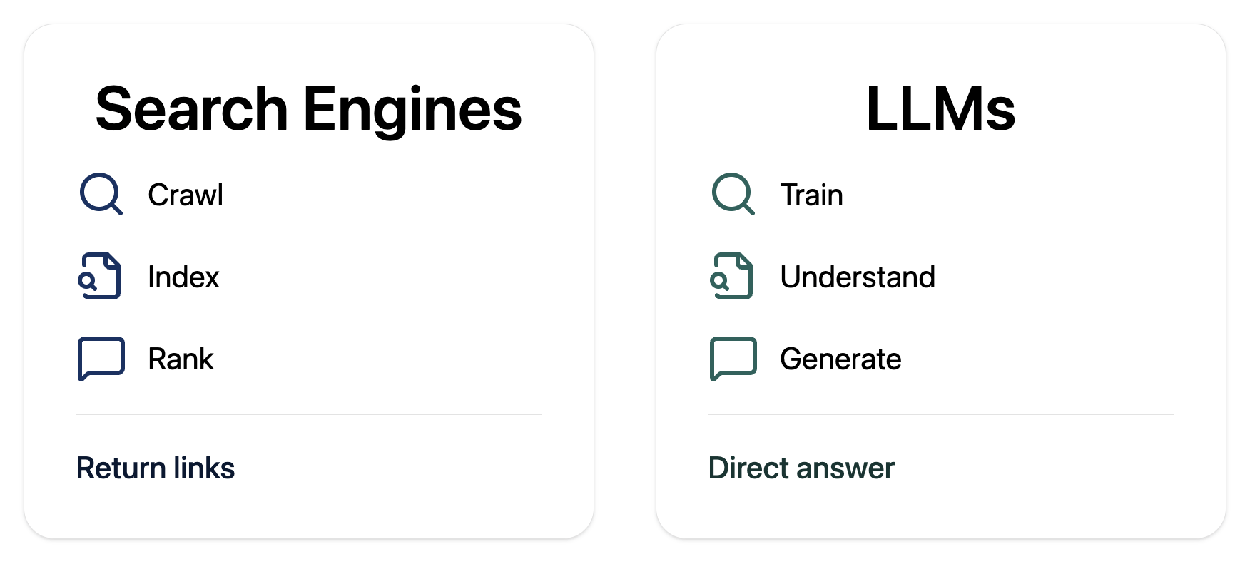 LLMs, on the other hand, are trained on vast amounts of text, everything from websites and books to reviews, forums, and open datasets. Instead of pointing you to links, they generate a direct answer in natural language. This makes them feel more like a trusted advisor than a search directory.