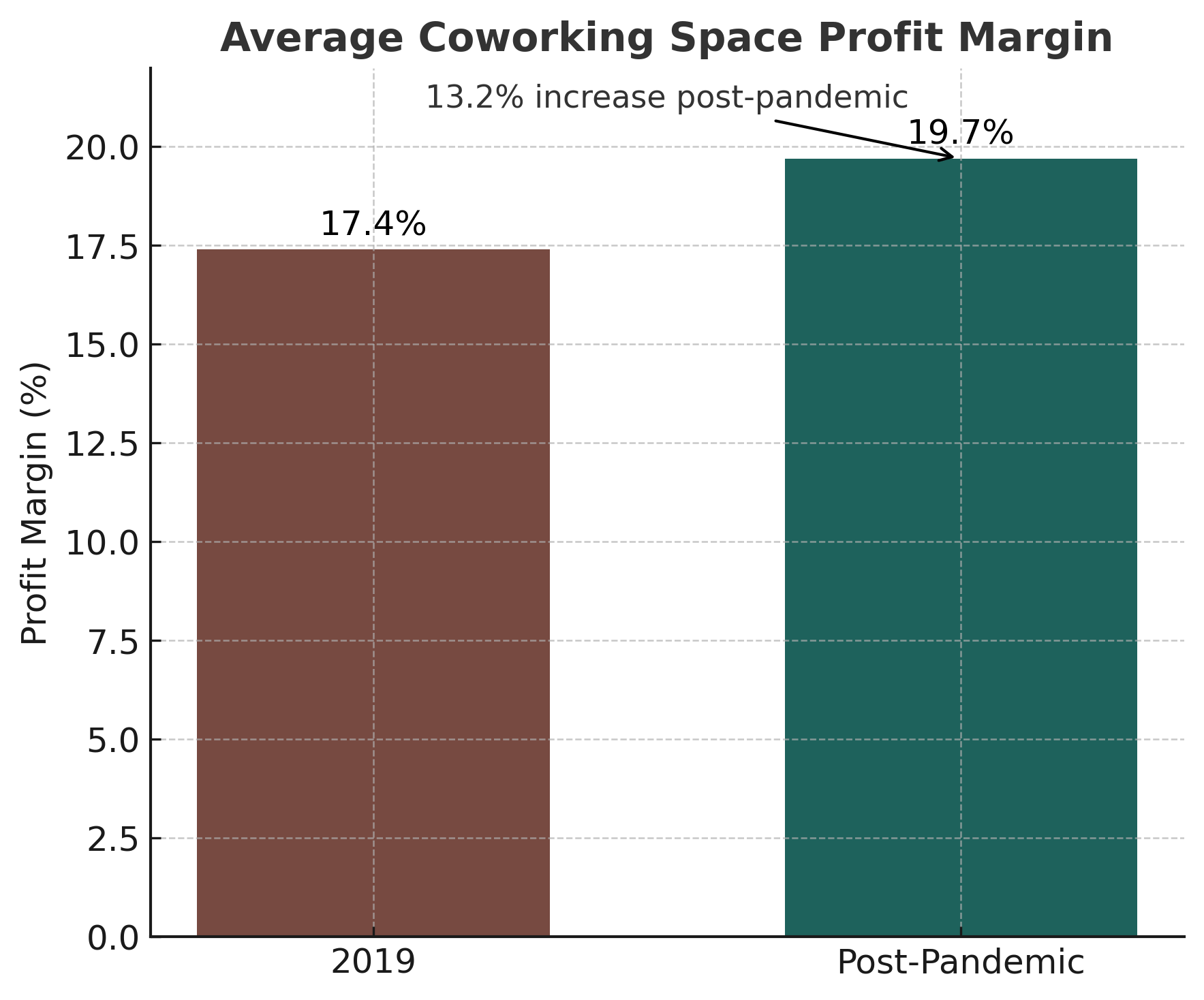 The average profit margin of a coworking space is 19.7%. In 2019, the average profit margin of a coworking space was 17.4%. This represents a 13.2% increase post-pandemic.