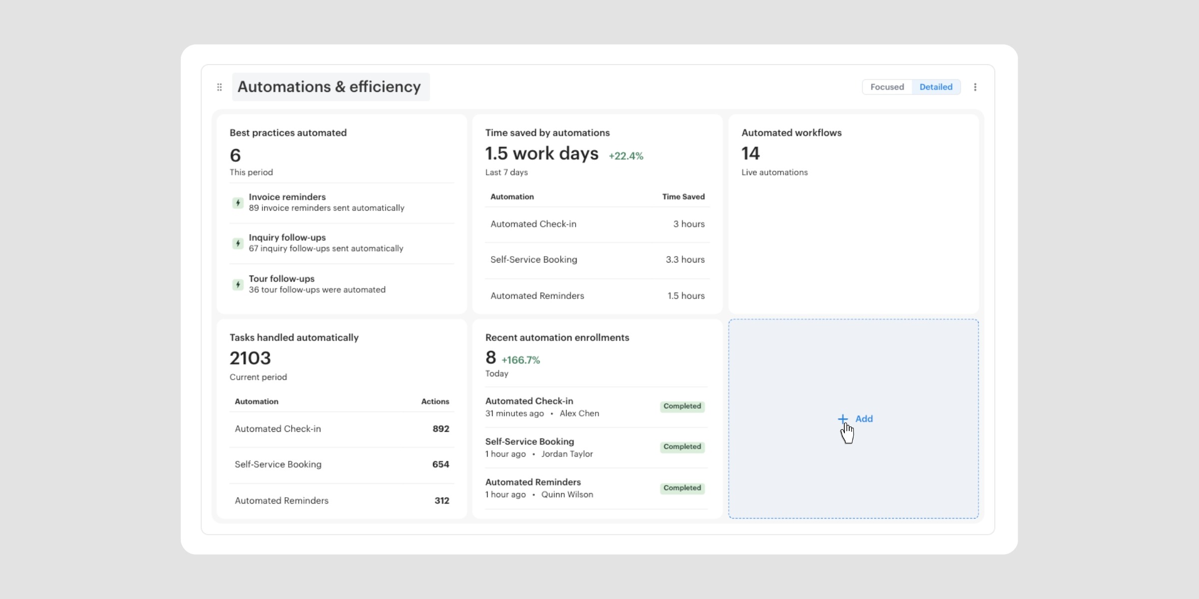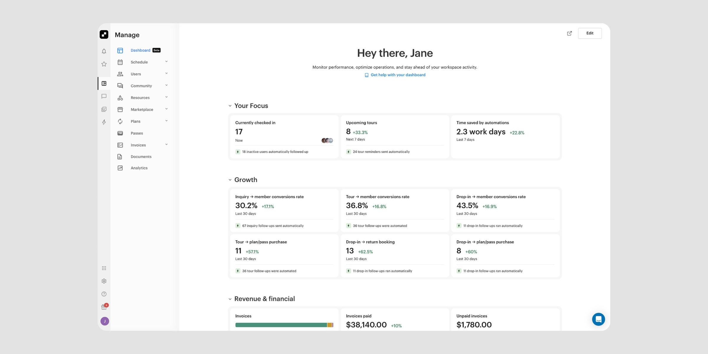 Revenue, bookings, assignments, check-ins, tours, invoices, automation performance: all visible from one screen. No more opening four different sections to answer a single question about how your space is doing today.