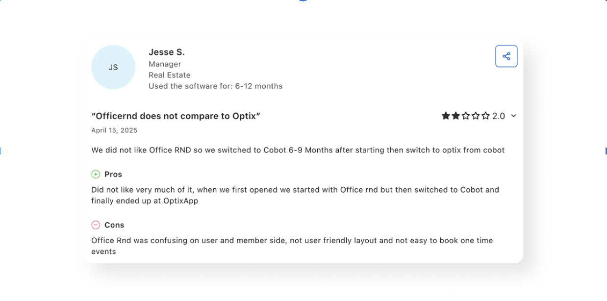 Optix’s commitment to user experience and top rated support makes them a good alternative for OfficeRnD users who are looking for a more modern and easy-to-use platform.