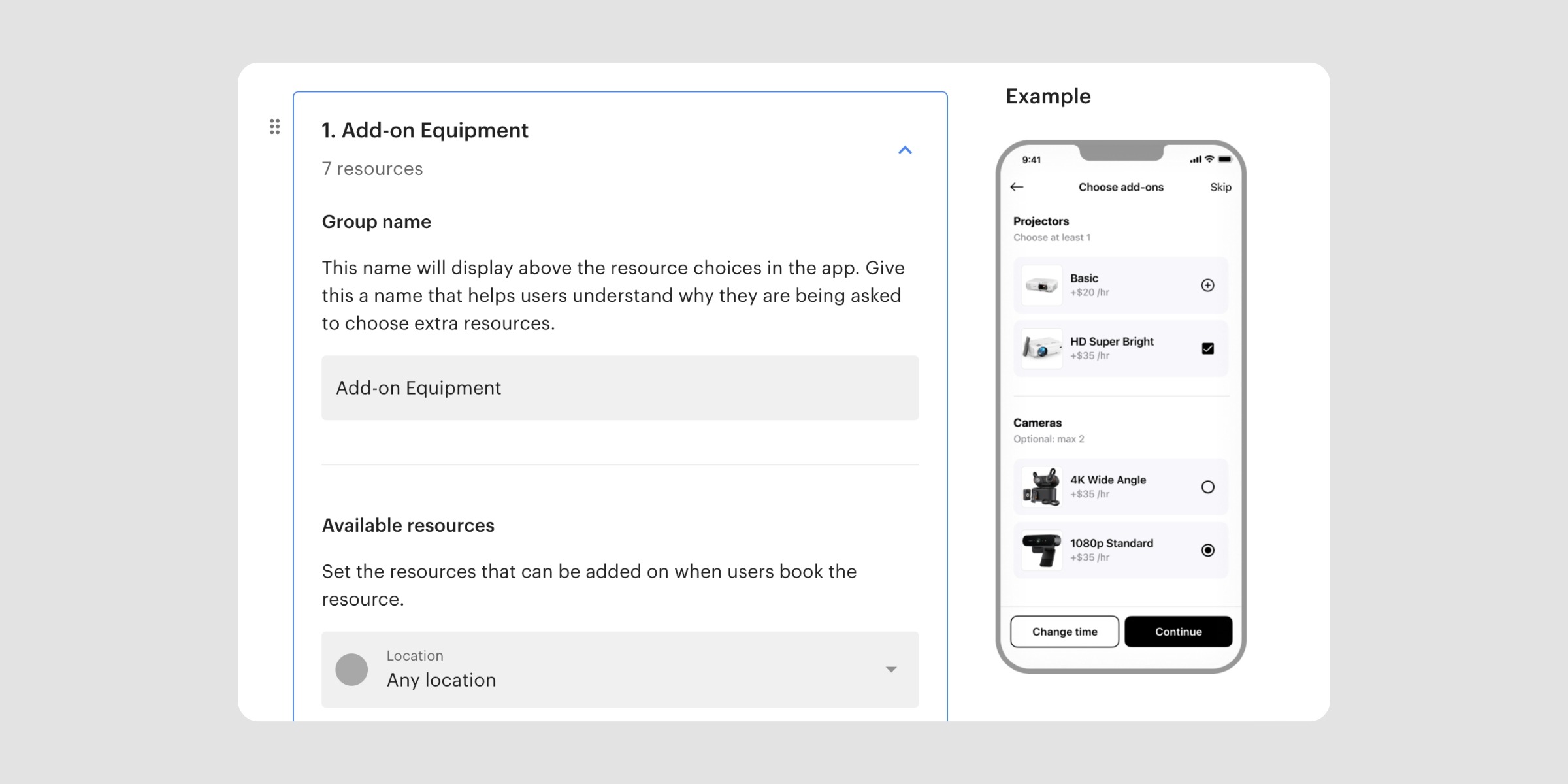 Add-on Resources lets you attach equipment, services, and extras directly to any bookable resource in your space. When a member books a resource with add-ons attached, they see and select them as part of the same booking flow.