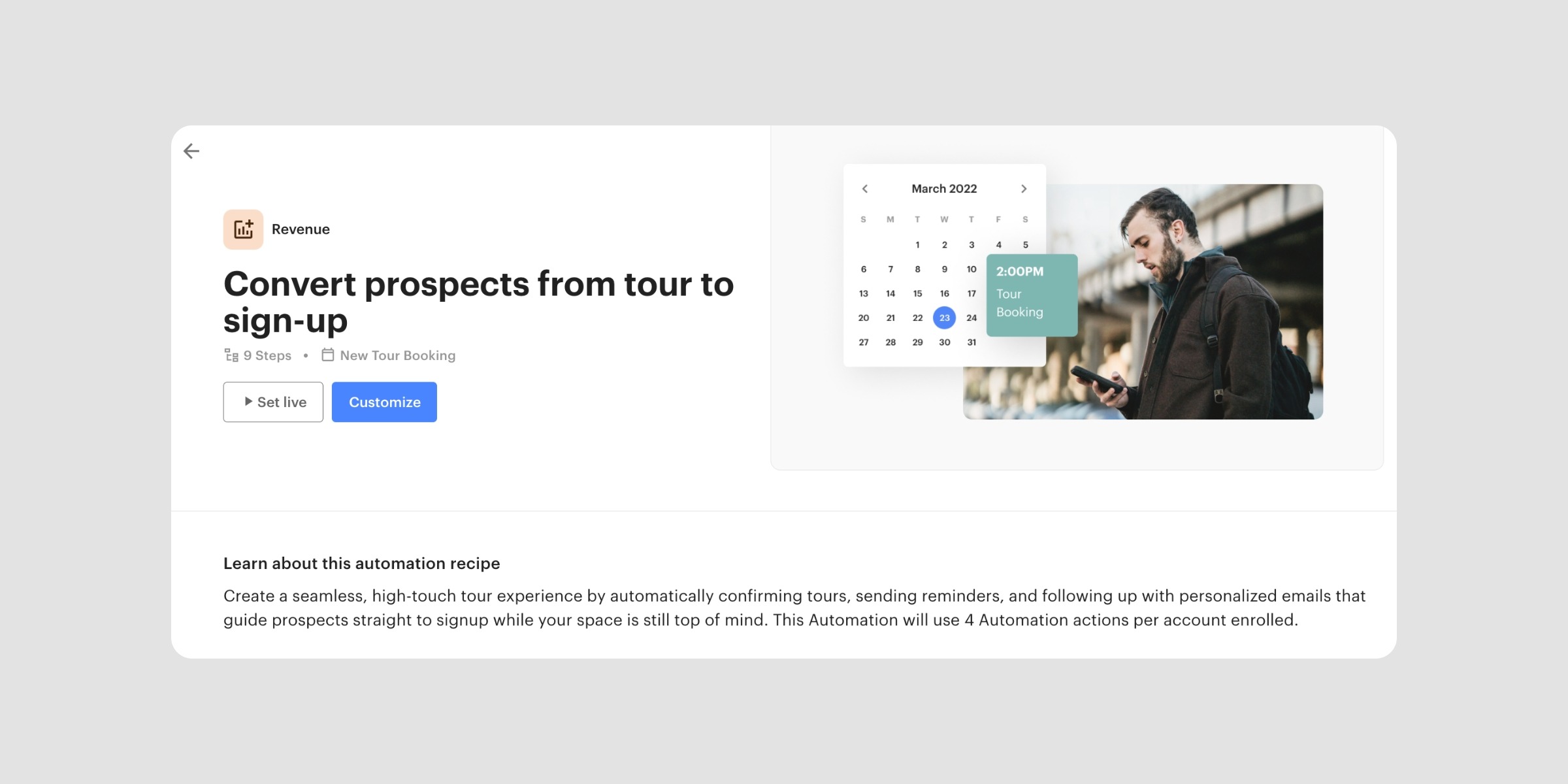 A new pre-built automation template is now available in your Automations+ library: Convert Prospects From Tour to Sign-Up. It covers the full sequence from tour confirmation through to post-visit follow-up.