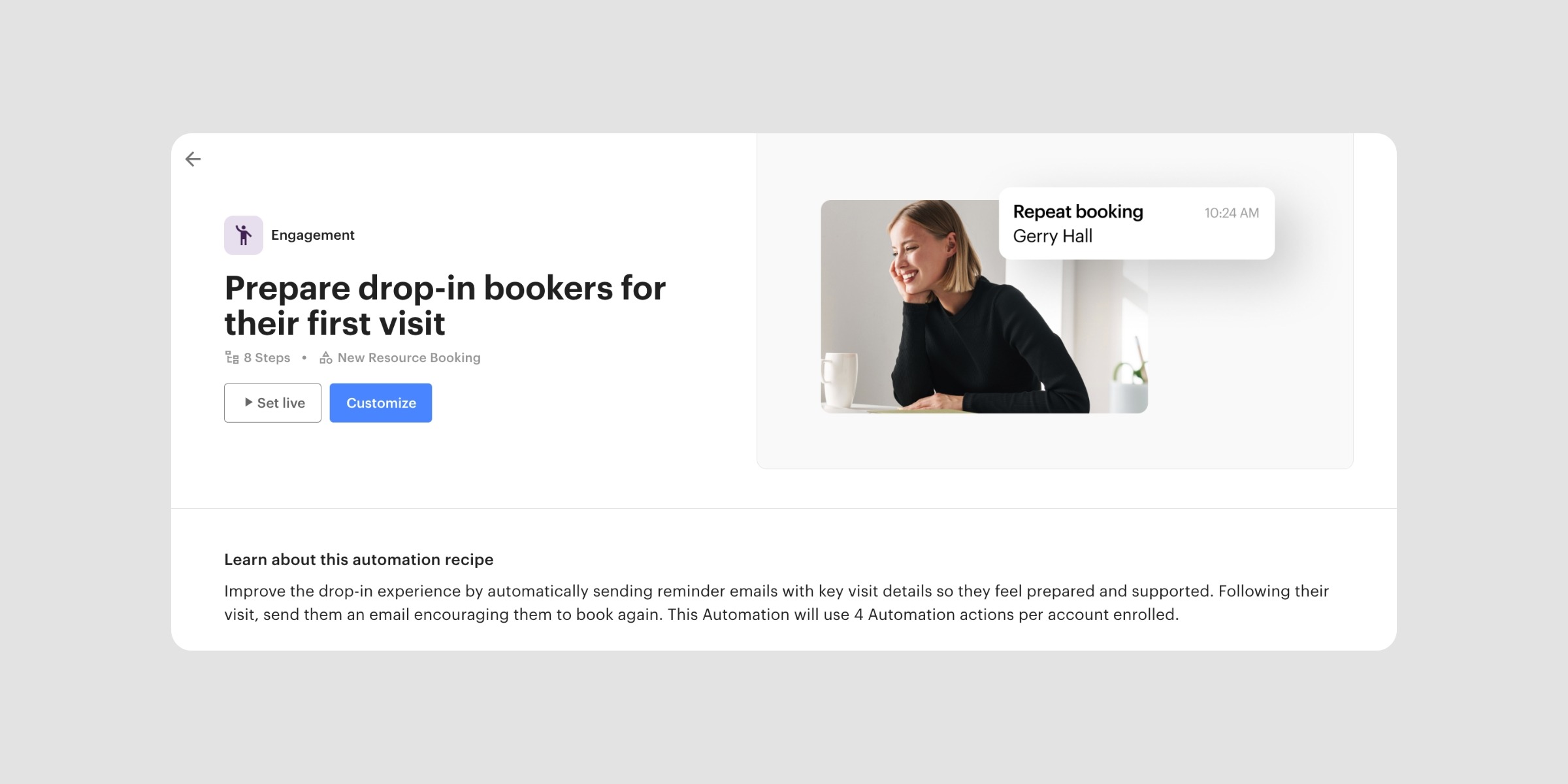 Also new in your Automations+ library: Prepare Drop-In Bookers for Their First Visit and Encourage Them to Book Again. This template is designed to reduce no-shows and drive repeat drop-in bookings.