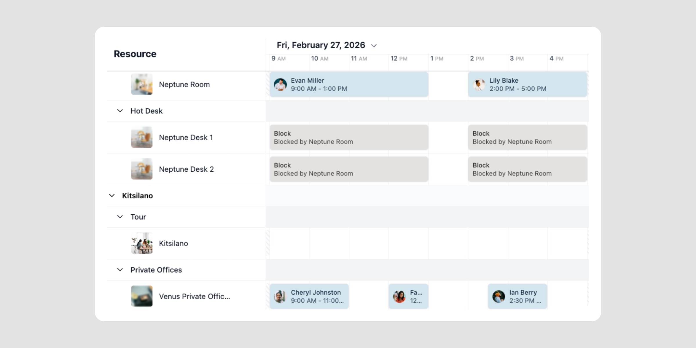 Timeline is a new scheduling view now available in your Dashboard. Where the standard calendar organizes around individual events, Timeline organizes around your resources: each bookable space gets its own row, with bookings, assignments, tours, and blocks displayed across the day in a single view.