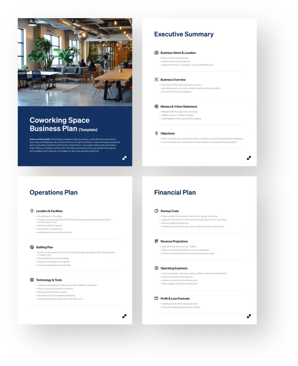 Whether you’re pitching to investors, mapping out your services, or clarifying your vision, this comprehensive template will guide you through every step of planning and launching a profitable coworking business.
